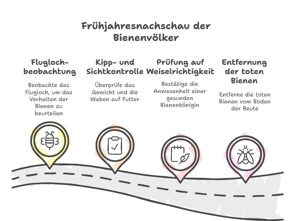 Nach den ersten Flugtagen im neuen Frühjahr und bei gutem Flugwetter kann die Frühjahresnachschau am Bienenstand durchgeführt werden.