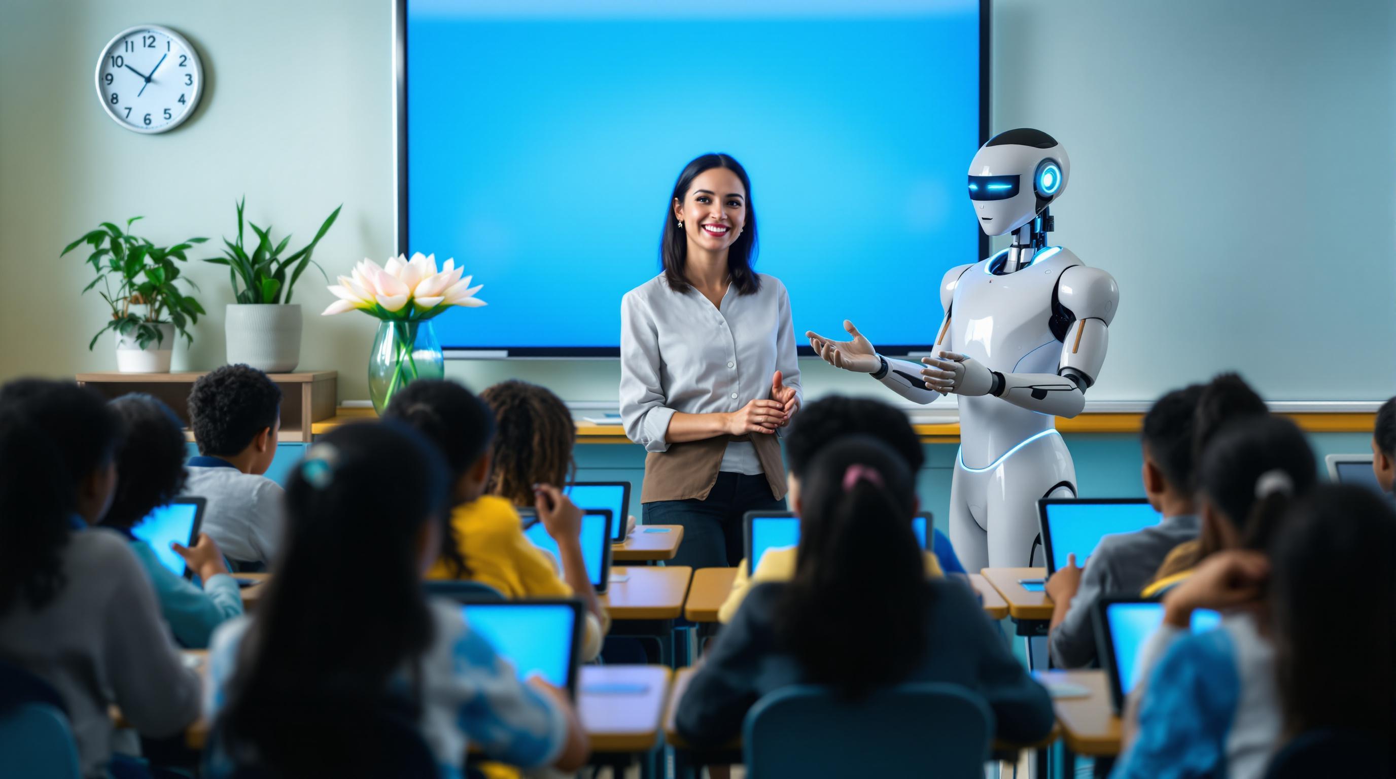 Wenn Lehrkraft und KI Hand in Hand gehen, dann kommt innovativer zukunftssicherer Unterricht heraus (generiert mit flux.ai)