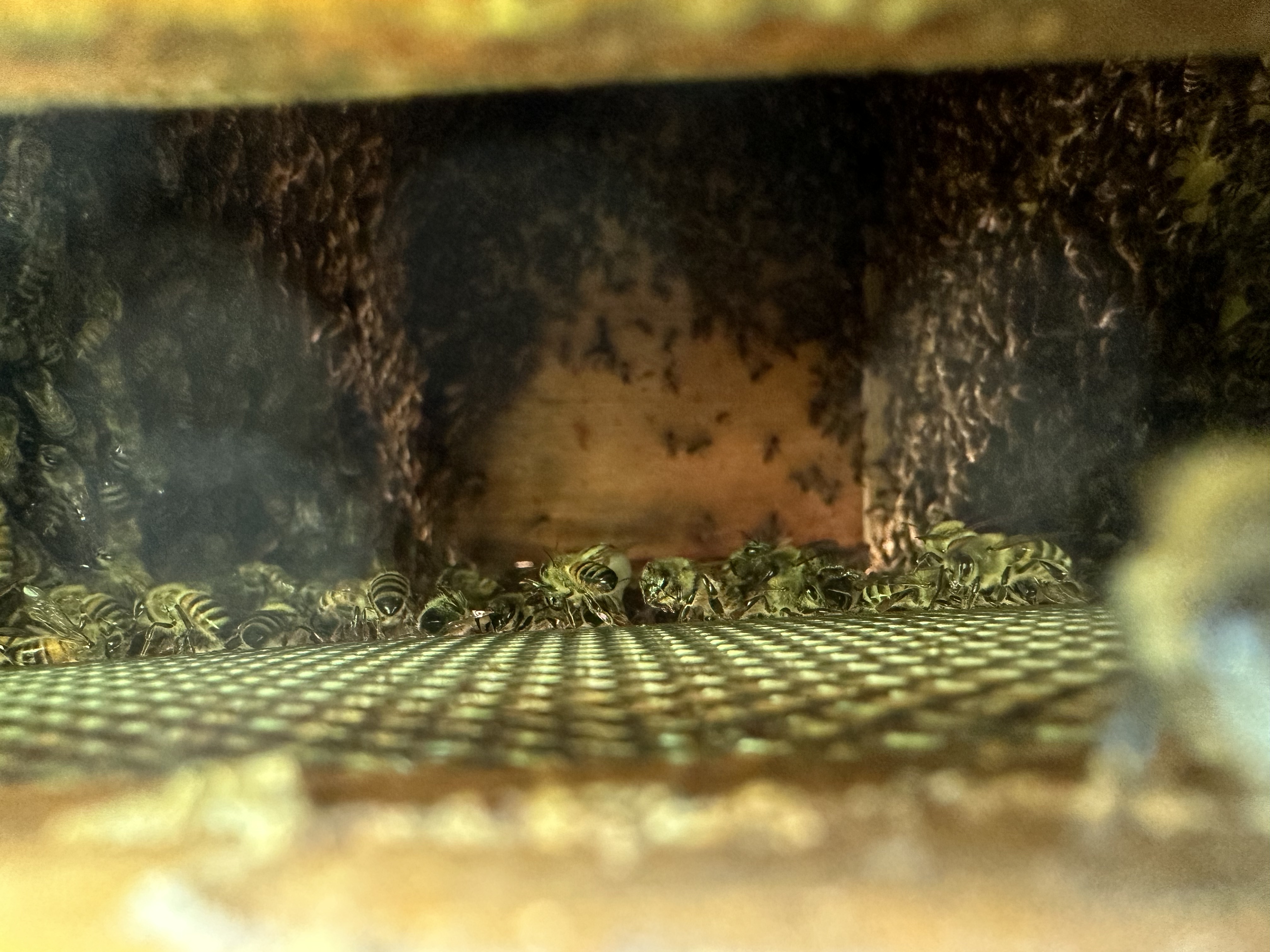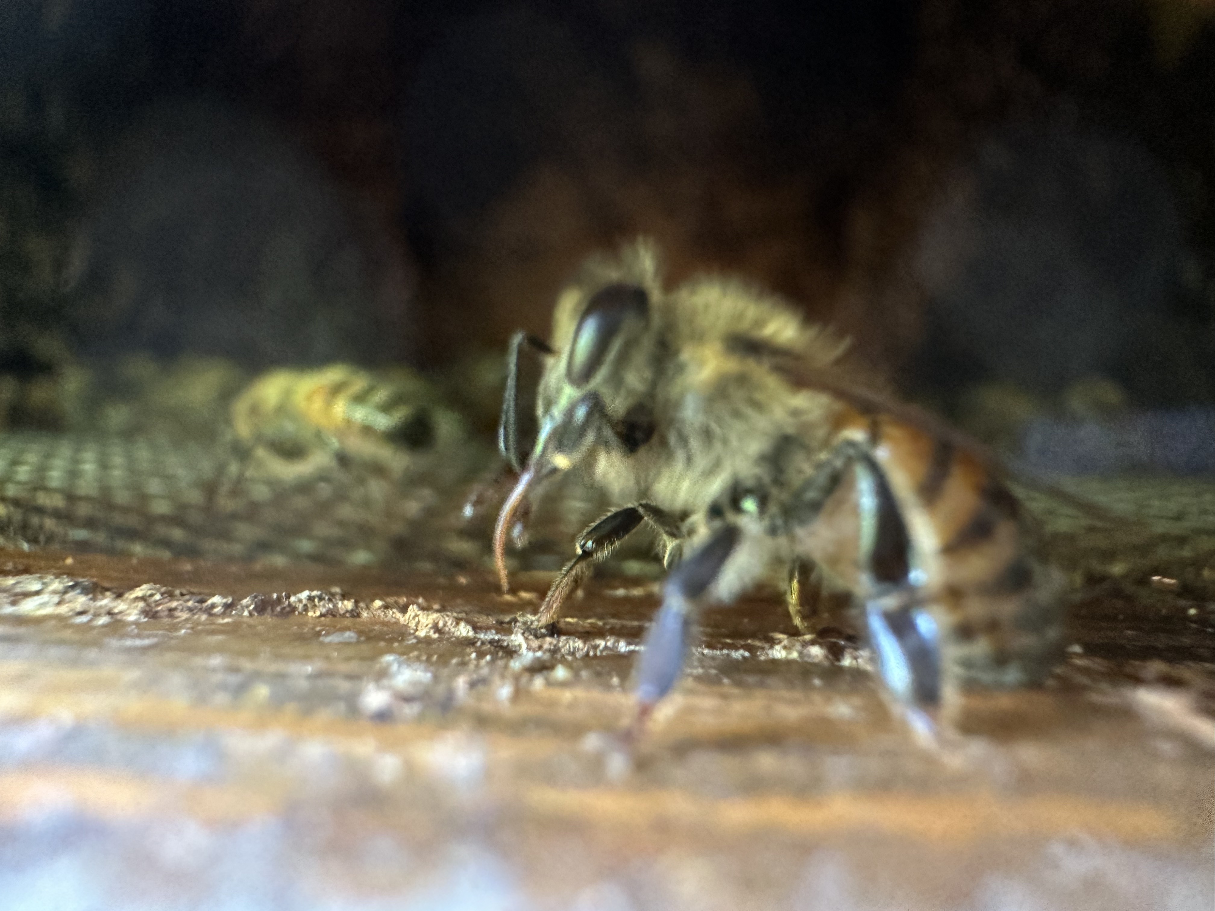 Während des Einlogierens des Kunstschwarms in die Beute fiel die Wabenstetigkeit der Bienen auf: Auf 4 Rähmchen konnten sich die 25.000 Bienen nicht verteilen und bildeten innerhalb der Beute eine Traube. Löste man die Plastikabdeckung ein wenig von der Beute so flogen nur wenige Bienen auf. Die meisten verblieben in der Traube und in der Beute. Ich denke die Durchschau in Zukunft wird bei dieser Bienenart sehr angenehm und benötigt nicht so viel Rauch.