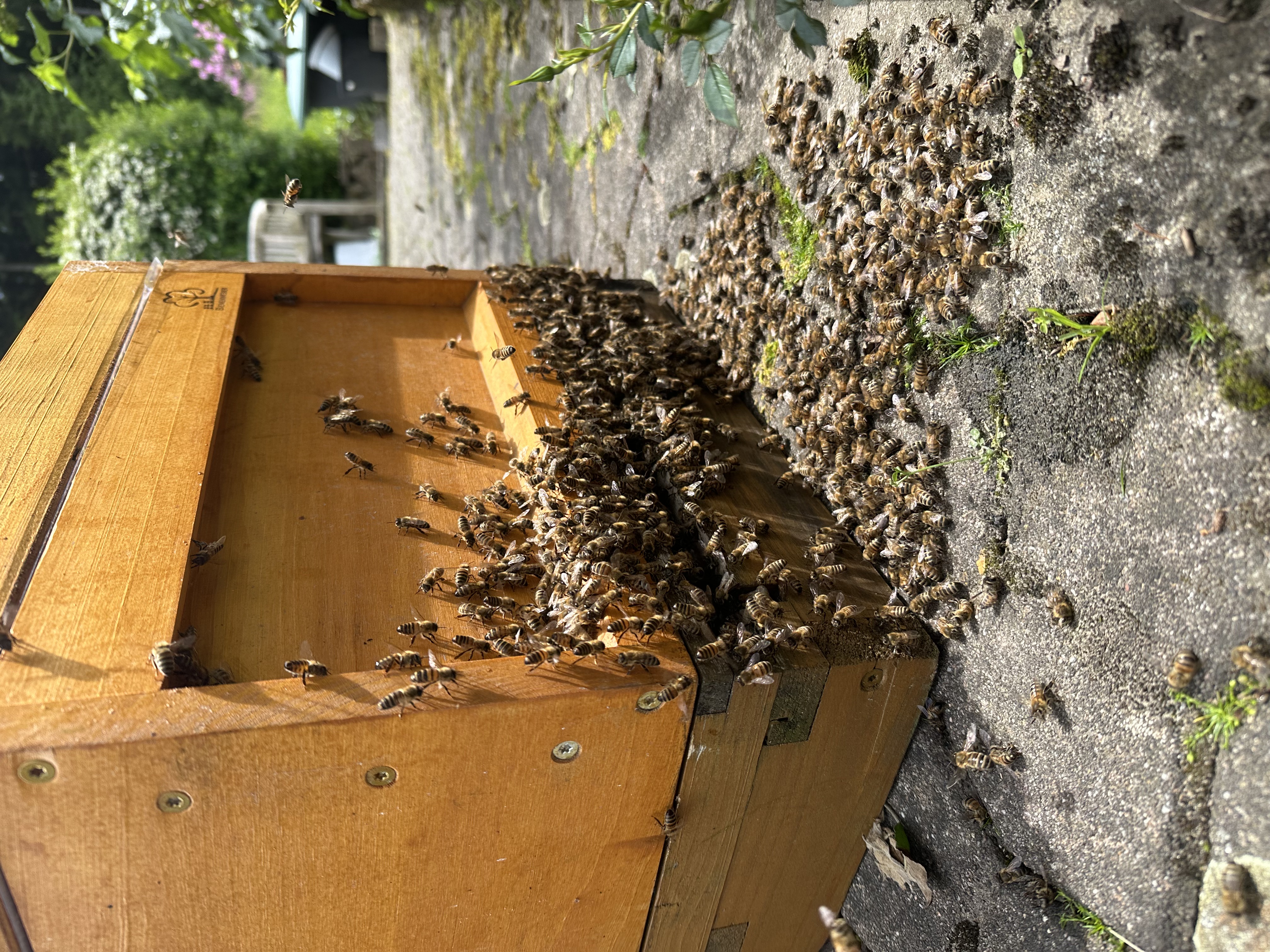 Das Auflösen der Traube und die Aufnahme des Flugbetriebes bei der Beute zeigte mir, dass die Königin mitgefangen wurde. Und wieder bekam ein Schwarm ein neues Zuhause.