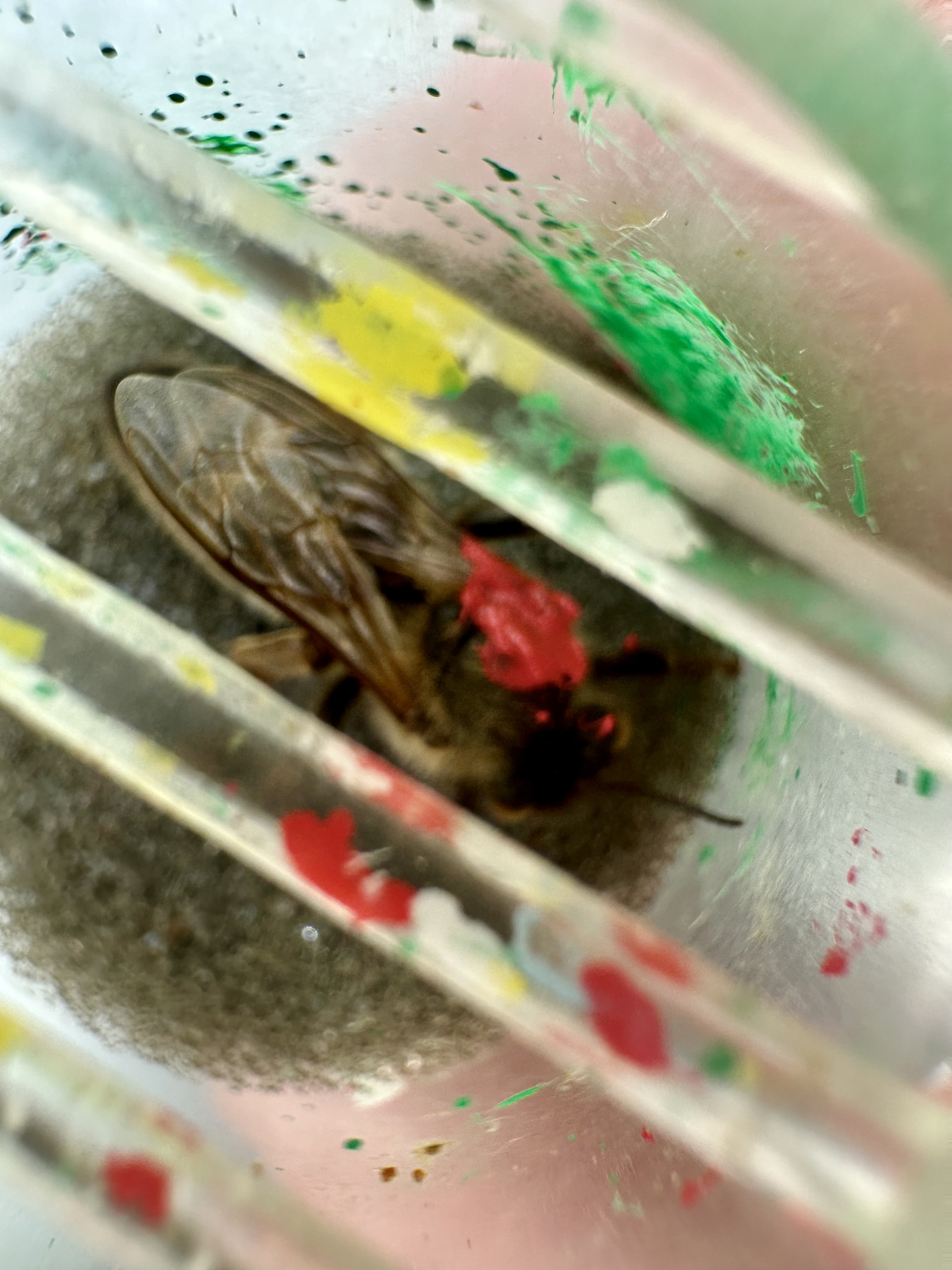Einjährige-Fremdschwarmkönigin Eine schöne schlanke Königin (nicht meine) im frisch gefangenen Schwarm. Ich schätze sie aus dem letzten Jahr, daher wurde sie gründlich mit Rot von mir eingepinselt. Man sieht sie hier etwas unglücklich im Zeichnungsrohr.