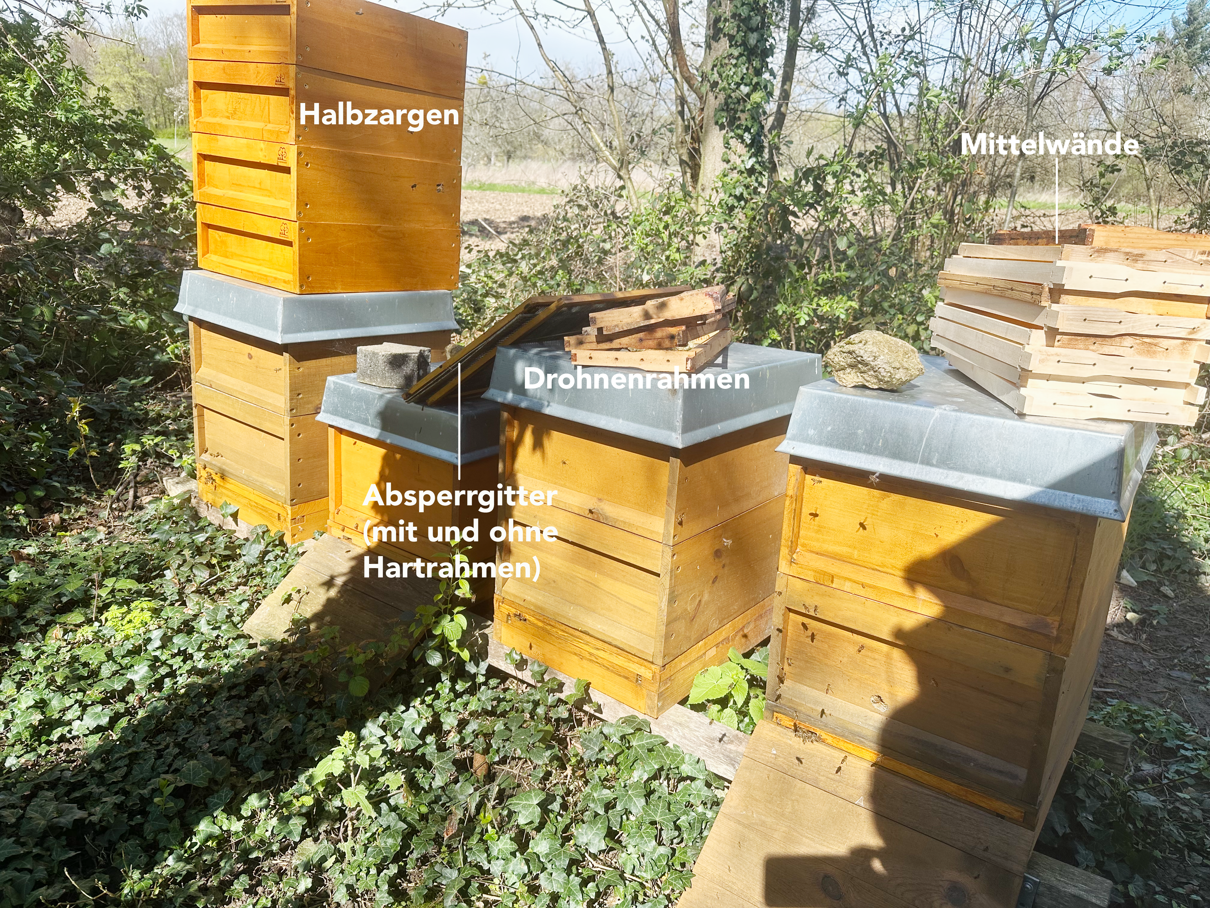 Für die Erweiterung werden Zargen als Honigräume (Halbzargen wie in meinem Fall oder Zargen mit fertig eingelöteten Mittelwänden), Drohnenrahmen (einfach entdrahtete alte Rähmchen), Mittelwände für das evtl. Ersetzen von Altfutterwaben bentötigt.