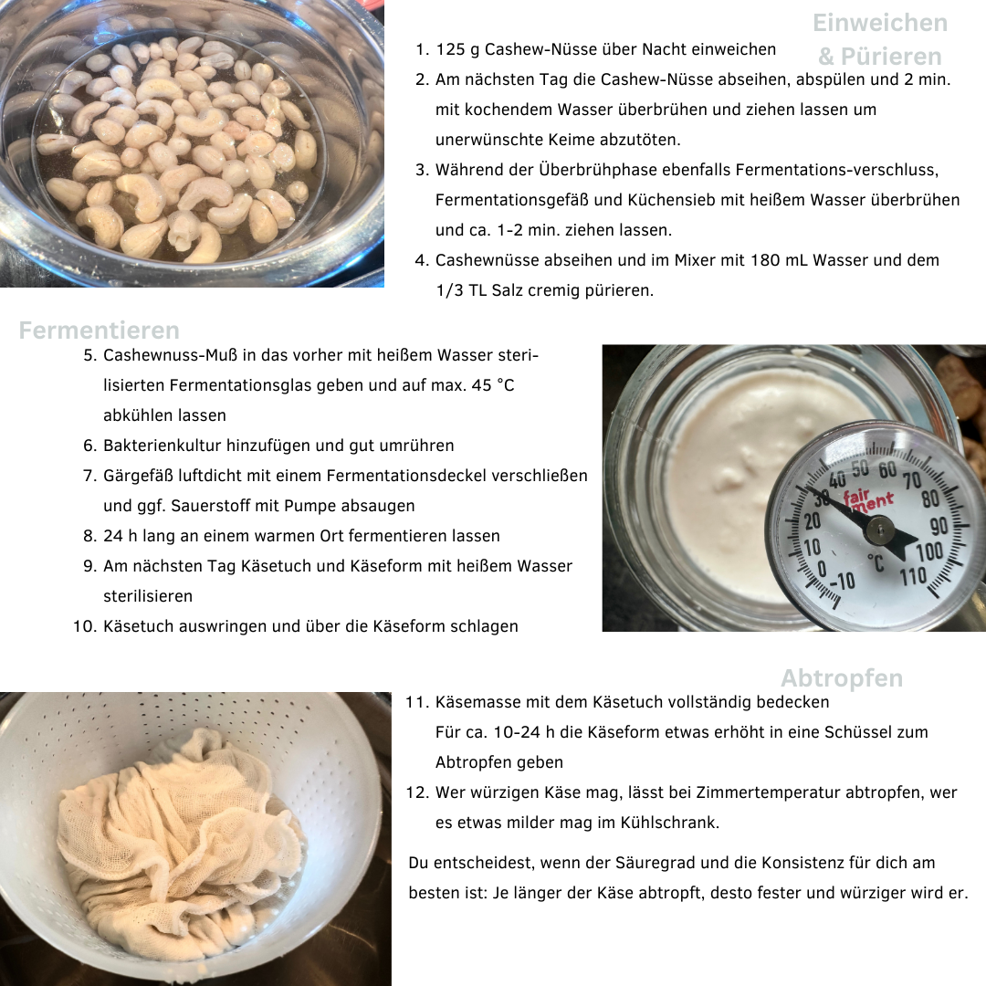 Die Kunst der Käseherstellung liegt an der Hygiene. Wir schaffen mit der Käseherstellung ein ideales Klima für allerlei kleiner nützlicher und unnützlicher Mikroben, die uns bei der Fermentation von Rohmassen aller Art helfen. So entsteht z.B. in diesem Rezept aus Cashewpürée ein leckerer Frischkäseersatz, der weiter verfeinert werden kann.