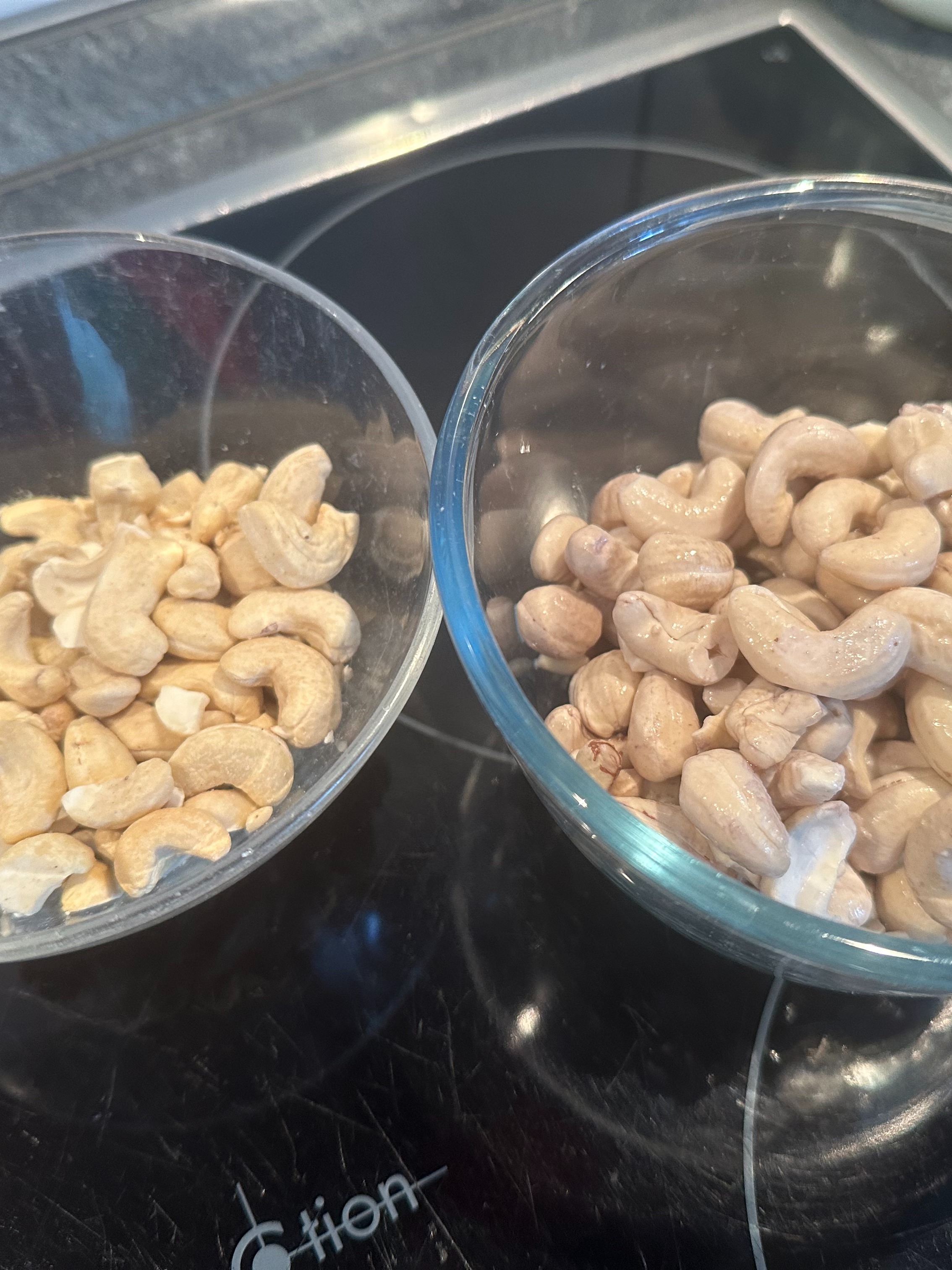 unbehandelte vs. eingeweichte CashewnüsseWie alle guten Dinge benötigt auch Käse zur Herstellung und Reifung Zeit und verschiedene Schritte. Am Abend vor der Käseherstellung werden daher die Cashewnüsse über Nacht eingeweicht. Das Einweichen lässt die Cashews quellen, ihre Konsistenz wird dadurch etwas weicher und besser pürierbar.