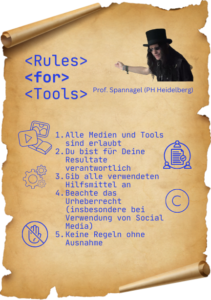 Prof. Spannagel von der PH Heidelberg hat sich zur Verwendung von KI in seiner Lehre sehr früh Gedanken gemacht. Er entwickelte sein Regelwerk Rules for Tools (vers. 2.2 vom Oktober 2023) für die Nutzung von Hilfsmitteln in der Erstellung von schriftlichen Arbeiten.
