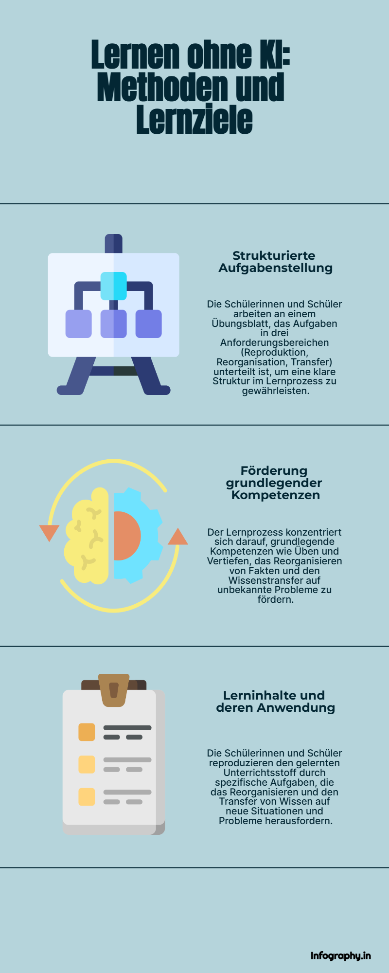 Die Lehrkraft diskutiert nochmals die oben genannten Inhalte mit den Schülerinnen und Schülern im Plenum. Danach folgt der Lernabschnitt Lernen mit KI.