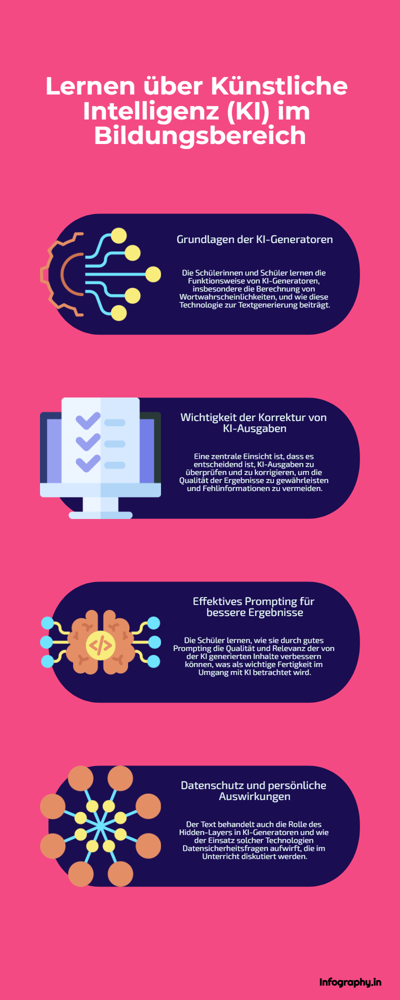 Die Schülerinnen und Schüler erarbeiten sich mit Hilfe eines Informationsblattes, wie KI-Generatoren arbeiten. Sie erfahren, wie wichtig die Korrektur von KI-Ausgaben sind. Und sie erfahren, wie gutes Prompting geht.